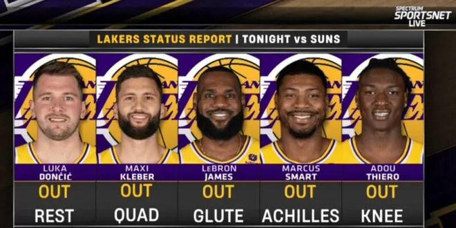 卢卡-东契奇(轮休)、克勒贝尔(四头肌受伤)、詹姆斯(臀部肌肉受伤)、斯马特(跟腱受伤)和阿杜-蒂耶罗(膝盖受伤)。