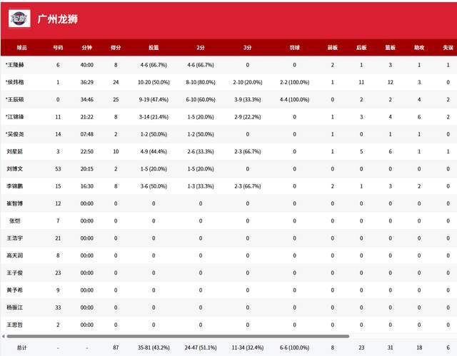广州龙狮青年队3人得分上双,王辰硕25分4助攻,侯炜楷24分12篮板3助攻,刘星延10分6篮板。