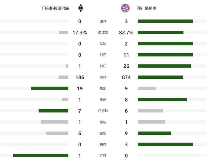门兴vs拜仁全场数据:射门1-27,控球率17%-83%