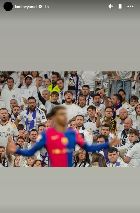 雷速体育10月26日讯 新赛季西甲首回合“国家德比”即将在北京时间今晚打响,赛前巴萨小将亚马尔在社交媒体发布了上赛季巴萨客场4-0大胜皇马之时,自己在对手球迷的怒视之下扬手庆祝的照片。
